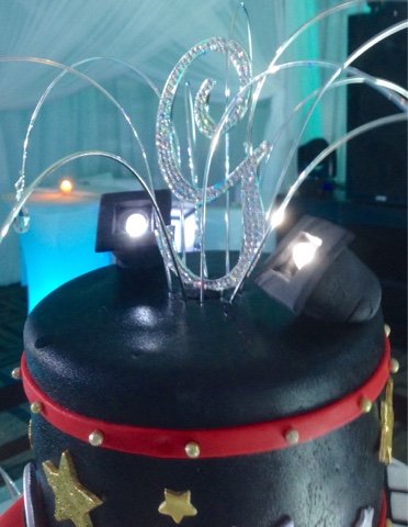 We love a good Bat Mitzvah! We were lucky enough to make a Hollywood style cake for this great birthday event. We decided to make a simple cake stand just to make the cake a little more festive. We used a couple of 24" covered cake drums. We spray painted the area that were going to show with silver spray paint to cover some of the embossed print. We would have recovered them but there isn't a material that I know that is 26" wide, so we would have had a seam and I thought that was worse than the little bit of a pattern. The cake was on another board, so it never touched the spray paint. We used a large circle punch from the scrapbook department and cut black contact paper. We used a 5" tall Styrofoam cake dummy and covered it with a printed film strip (on cardstock, but paper would have worked). We used spray adhesive to attach this to the dummy. We hot glued a couple of strips of rhinestones to the top and bottom cake boards and the boards to the dummy. Be sure to line up the back sides (where things start/stop) all together like you would a tiered cake.